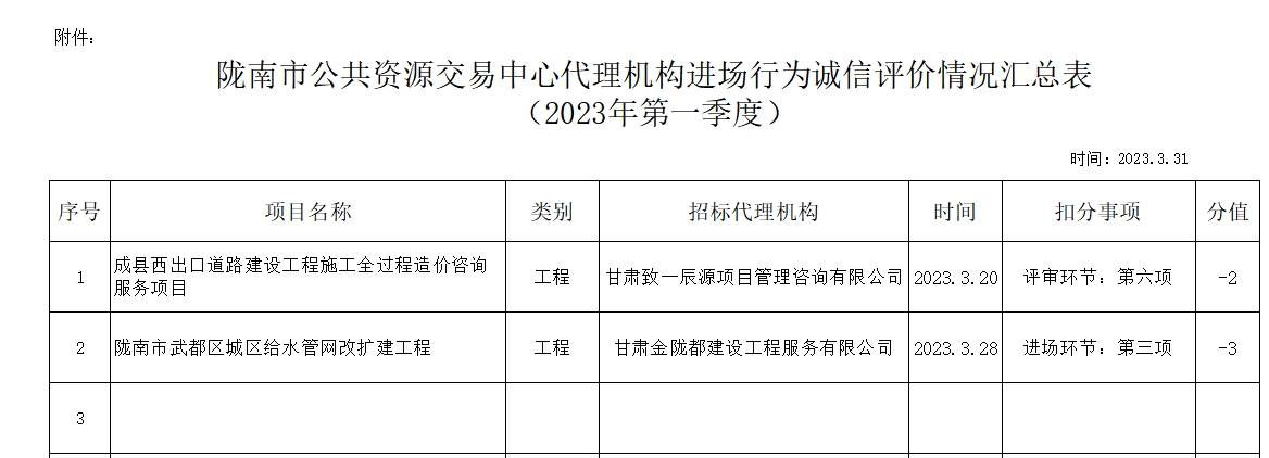 根據(jù)《甘肅省公共資源交易代理機構(gòu)管理辦法》(甘政辦發(fā)〔2019〕107號)和《隴南市公共資源交易中心代理機構(gòu)進場行為誠信評價實施制度(試行)》規(guī)定,現(xiàn)對2023年第一季度,共2家代理機構(gòu)2條進場行為誠信評價記錄予以通報(詳見附表)。請各代理機構(gòu)嚴格遵守各項規(guī)章制度、誠實守信,規(guī)范操作,為招標人和采購人提供專業(yè)、高效、規(guī)范的招標代理服務。