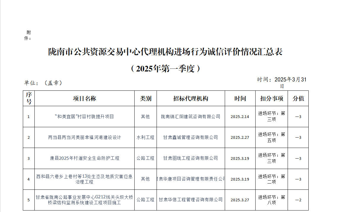 隴南市公共資源交易中心關(guān)于2025年第一季度代理機(jī)構(gòu)進(jìn)場(chǎng)行為誠(chéng)信評(píng)價(jià)結(jié)果的公示