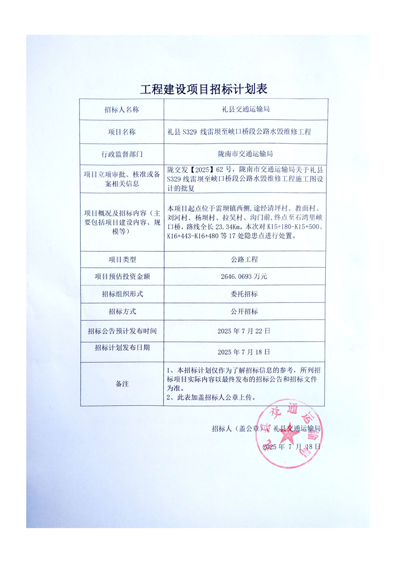 禮縣S329 線雷壩至峽口橋段公路水毀維修工程