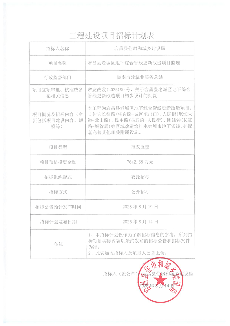 附件:宕昌縣老城區(qū)地下綜合管線更新改造項(xiàng)目監(jiān)理工程招標(biāo)計(jì)劃表.pdf
