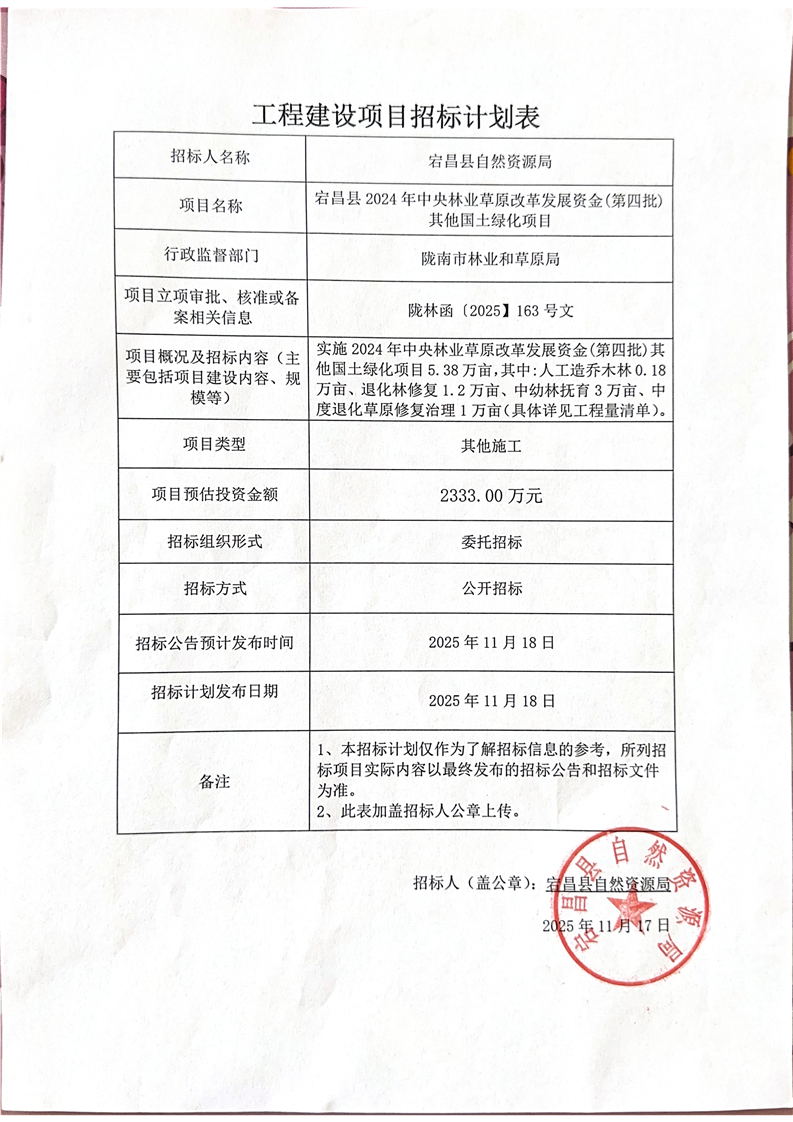 宕昌縣2024年中央林業(yè)草原改革發(fā)展資金(第四批)其他國土綠化項目