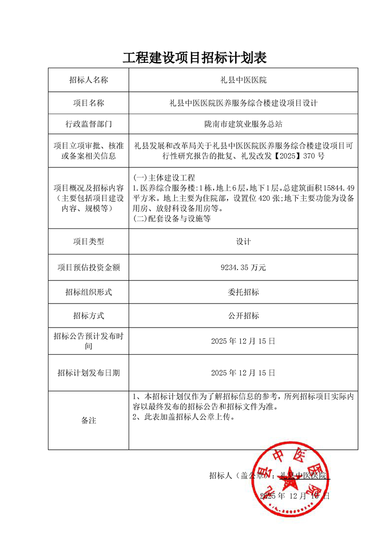 禮縣中醫(yī)醫(yī)院醫(yī)養(yǎng)服務(wù)綜合樓建設(shè)項(xiàng)目設(shè)計(jì)