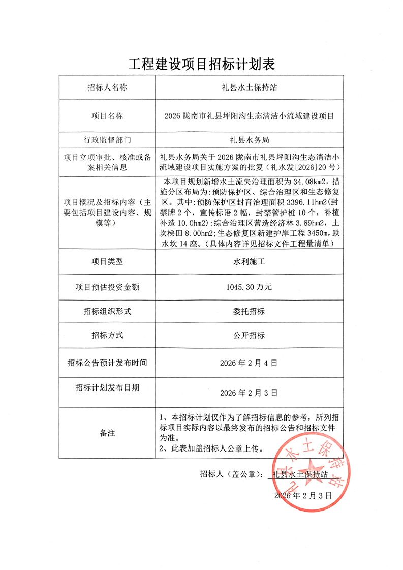 2026隴南市禮縣坪陽溝生態(tài)清潔小流域建設(shè)項(xiàng)目
