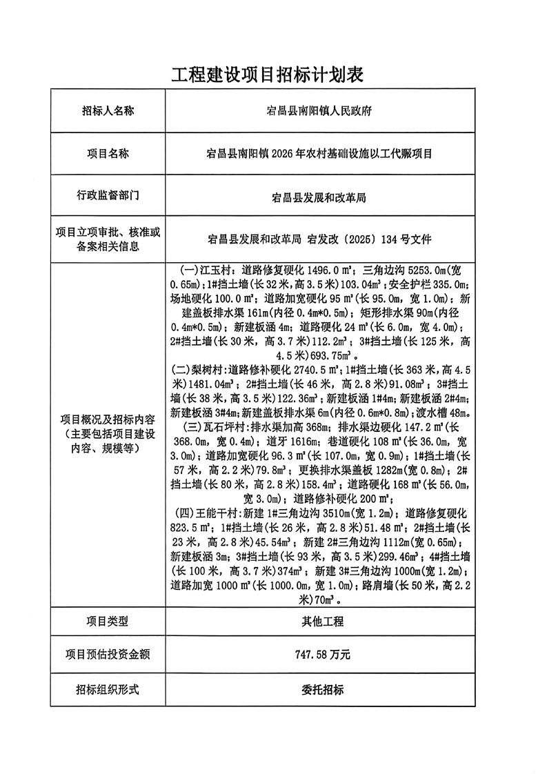 宕昌縣南陽鎮(zhèn)2026年農(nóng)村基礎(chǔ)設(shè)施以工代賑項目