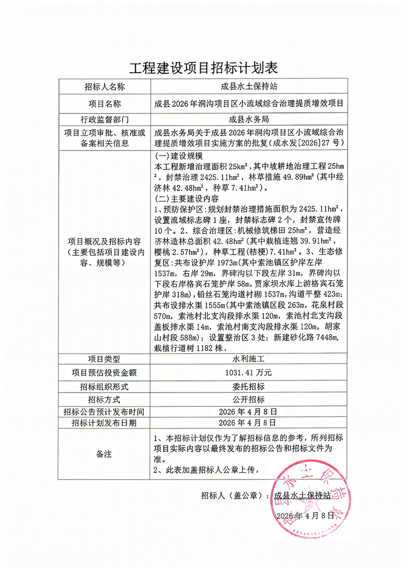 成縣2026年洞溝項(xiàng)目區(qū)小流域綜合治理提質(zhì)增效項(xiàng)目