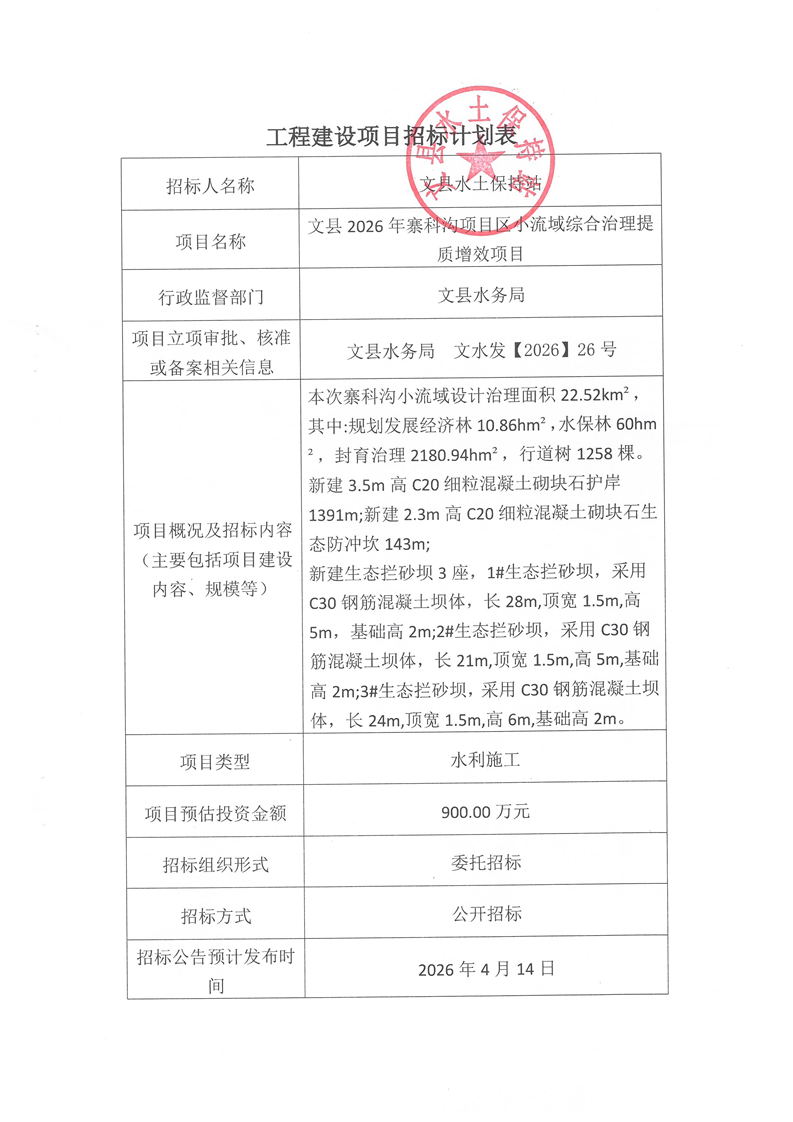文縣2026年寨科溝項(xiàng)目區(qū)小流域綜合治理提質(zhì)增效項(xiàng)目