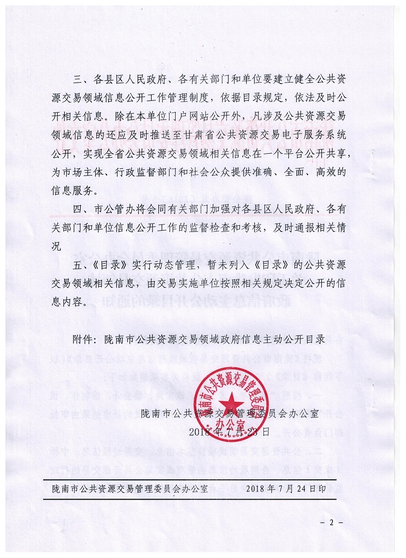 隴南市公共資源交易管理委員會辦公室關于印發(fā)隴南市公共資源交易領域政府信息主動公開目錄的通知