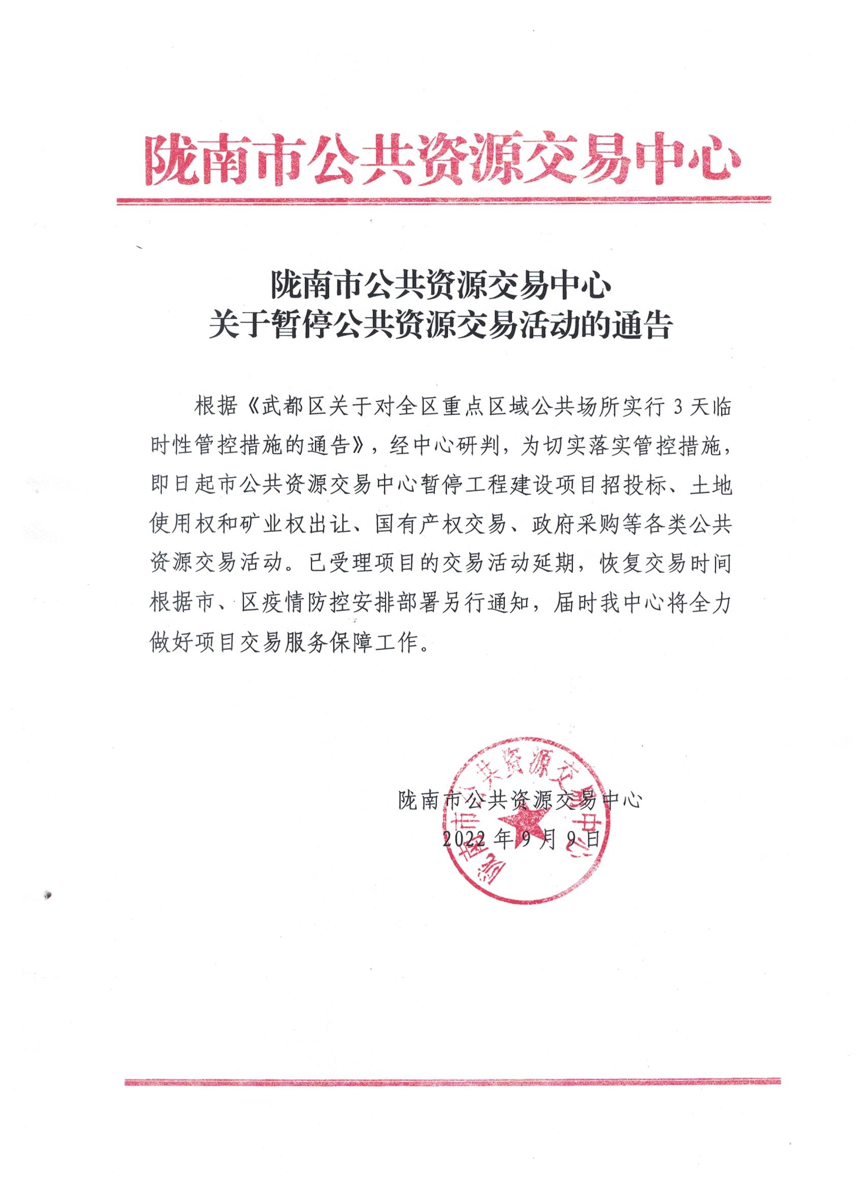 隴南市公共資源交易中心關(guān)于暫停公共資源交易活動的通告